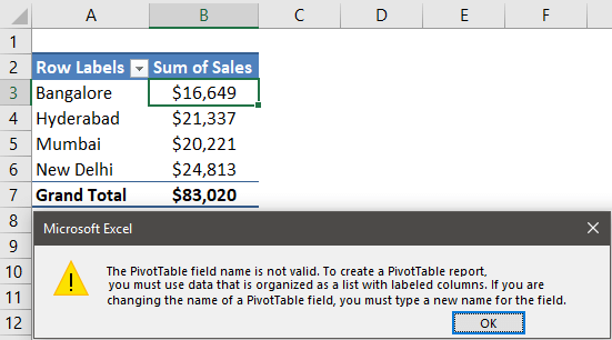 Но в тот момент, когда мы нажмем кнопку «Обновить сводную таблицу», ниже появится сообщение об ошибке «Имя поля сводной таблицы недействительно».