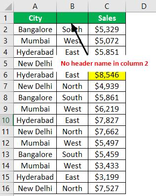 Вы знаете, какие данные нужно организовать для вставки сводки; в противном случае мы получим эту ошибку. Все столбцы данных должны иметь значение заголовка; если какая-либо ячейка пропустит, мы получим эту ошибку. Например, посмотрите на изображение ниже.